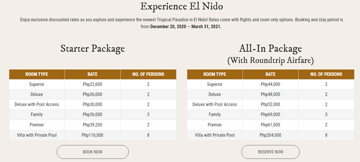 Charlie’s El Nido is another resort you can book if you want a flight + accommodation package. Rates start at Php44,000 per person for a minimum of 2 persons, for a stay in the Superior Room. Included in the rates are two rounds of cocktail by the pool, one private island hopping tour, and 10% off on food and drinks as well as spa services, laundry, and mini bar.
