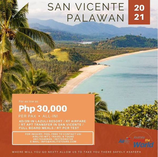 If a truly all-in package is what you’re after, don’t miss Airlite Travel’s promo for Lazuli Resort in San Vicente. It includes 4D/3N stay, roundtrip airfare via Airswift, full-board meals, transfers, and most important of all, RT-PCR test. You can enjoy all these for just Php30,000 per person. Pretty neat, right? The travel agency also offers packages for the luxury resorts in Palawan such as the Miniloc Resort.